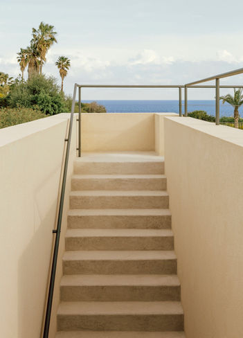 Spatial design thoroughly considers Mediterranean climate conditions. The building's overall form effectively regulates interior light and ventilation through strategic opening arrangements, while utilizing thick earth-toned textured walls to provide natural thermal comfort. The uncovered internal pathway serves as a distribution axis, independently connecting rooms and establishing a continuous relationship between sleeping and living areas. This alley-like walkway leads from the main entrance to the sea, weaving between rooms in an alternation of compressed and expanded spaces.