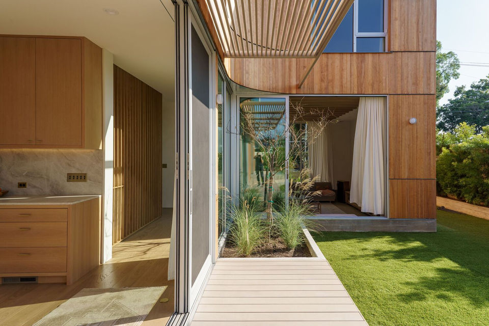 At the heart of the design lies a sunken living room, where 10-foot sliding doors dissolve the boundaries between interior and exterior spaces. This thoughtful element serves a dual purpose - facilitating natural ventilation while creating seamless connections to the meticulously landscaped gardens. The architects have employed a sophisticated rainscreen system for the wood siding, demonstrating their commitment to both aesthetics and functionality. This technical solution creates an air gap that serves as a thermal buffer, acoustic barrier, and ensures the longevity of the natural materials.