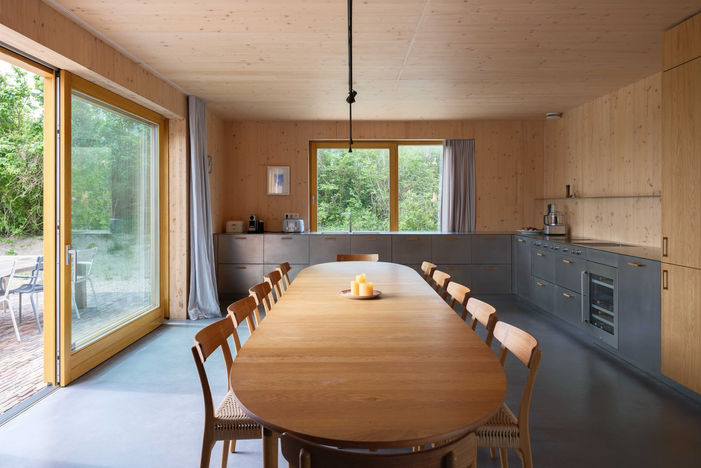 Sustainability strategies permeate the entire design process. Villa BaZ is primarily constructed from bio-based materials, meeting the strictest BENG standards, and employs solid timber structural systems throughout floors, walls, and roof. The combination of floated screed flooring with exposed timber structure creates a strikingly warm, natural interior environment, while exterior concrete retaining walls dialogue with the ever-shifting dune landscape.