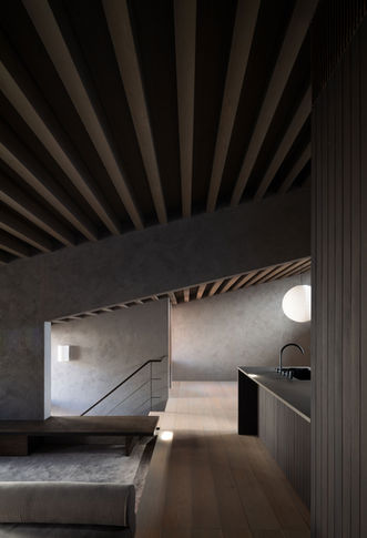 立面处理展现了结构与环境空间的亲密关系。壁柱创造的回廊般空间成为历史上用于隔离与连接不同领域的建筑元素在当代的重新诠释,在这里作为街道、绿道与住宅接触的临界空间而存在。这种过渡性空间创造出业主所描述的时间流逝变慢的独特体验。壁柱框定的深邃开口强化了室内静谧与外部动态的对比意识,将风中摇曳的绿道树木和行人动态清晰地框取出来,而内部的宁静在这种对比中得到强化,营造出仿佛从洞穴中观察外部世界般的原初感受,让意识向当下这一瞬间敞开。