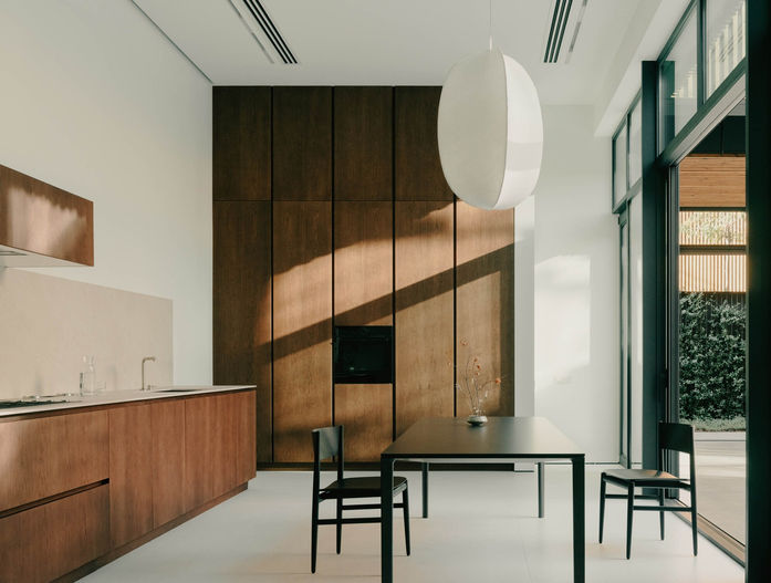 材料过渡强化了项目的倒置逻辑,创造出从外部到内核的空间非物质化序列。朝向街道的立面采用烧焦木材包层,这是一种历史上用于保护木材免受风化的传统技术,在此形成密实而保护性的外壳。进入庭院内部,这种深色外壳转变为自然、未经处理的木材,引入温暖、质感和触感。室内空间以白色饰面处理,使光线、比例和空间关系成为定义氛围的主导因素。这种从烧焦木材到自然木材再到抽象白色的渐进过渡,体现了从外部领域到内部核心的运动,强化了空间的层次感和私密性的递进。