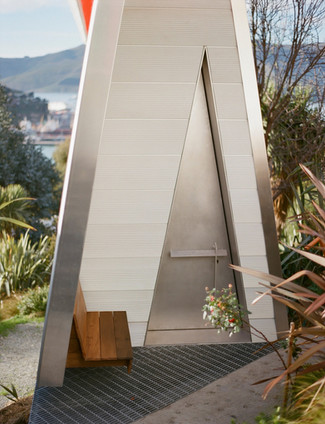 小堂谦逊的尺度掩盖了其建筑雄心。外立面采用建筑师定制设计的铝制风雨板,这是该事务所谨慎使用的标志性材料,既能捕捉海岸光线,又将建筑牢牢扎根于港湾环境。最引人注目的是三角形入口,将神学中的三位一体概念转化为几何形态的冥想空间和仪式性门槛。门边的小长凳邀请访客停下脚步脱鞋,建立起从日常到神圣的过渡仪式。