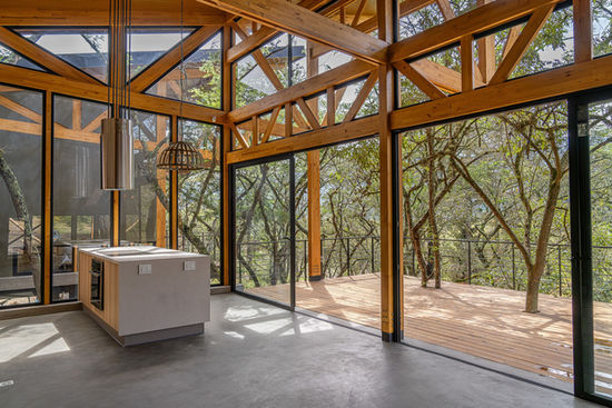 该项目最独特的设计特征在于其混合建造系统,将工业精度与本土智慧相结合。主要木结构抬高于混凝土和钢铁基座之上,升离地平面,最大限度地减少其在地形上的足迹,同时建立建筑师所描述的“轻盈艺术”。裸露的层压木框架既是结构也是温度调节器,通过被动环境策略过滤午后阳光并调节室内温度。当代bahareque墙体填充大麻和石灰,然后用当地土质抹灰、chocoto粘土和龙舌兰纤维完成,创造出会呼吸的围护结构,提供热质量的同时将建筑锚定于其地域背景。这些质感丰富的表面将室内空间转化为建筑师所称的“受控光线的洞穴”。