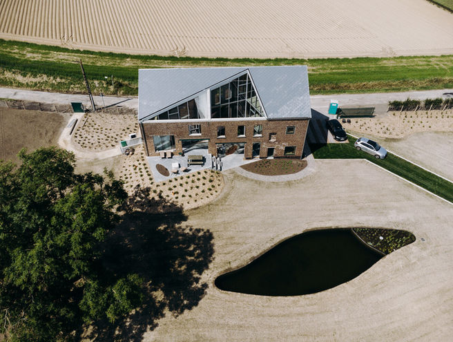 Denis Dujardin's landscape design plays a crucial role in shaping the setting, achieving fluid and respectful integration with the surrounding rural landscape through the use of local vegetation. Additionally, an ingenious and discrete solution has been developed to manage the area's excess rainwater, channeling it into a natural pond where it is purified and gradually filtered into the ground.