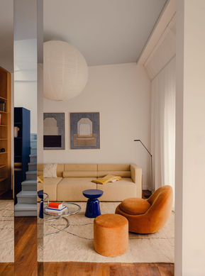 材料运用体现了与功能和美学的深度对话。与蓝色核心相呼应的是一个全高度壁柜单元,采用透明木材饰面和镜面板,在视觉上扩展了紧凑的公寓空间。浅蓝色窗帘可以隐藏起来打开所有空间,或关闭以隔离卧室并将其与社交空间分离。定制的黄油色沙发名为"Sophia 3000",专为房间设计,固定了起居区,为冷色蓝调提供温暖的对比。