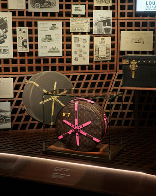 OMA的设计语言流利地表达着主题性与开放性的平衡。展览从五层的"起源"展厅开始,品牌历史以文物、文献和剪报云的形式在多面木质框架上呈现,这一框架呼应了韩国传统屏风的形态。地面层设有由270个"Boite Chapeau"帽盒构成的拱形"箱包景观"装置,形成一个沉浸式入口,引导访客进入路易威登商店。展览空间涵盖多样化的展陈策略:"手表"展厅以时间顺序展示路易威登设计的时计作品,手表箱包的图案转化为包裹房间的面板和屏幕;"野餐"展厅营造出"户外"氛围,便携箱包、餐具和露营车陈列在草坪上;"个性化定制"展厅将定制箱包拆解,创造出画廊式档案空间,展示每件独一无二的作品。
