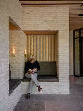 The building's gently undulating façade invites in shifting natural light throughout the day. Permeable walls filter and shape this light to create a dynamic interplay of shadow and atmosphere, making the architecture itself part of the spiritual experience. Materials such as brick, oak, and brass create a warm, timeless atmosphere. From the outside, the church appears as a sculpted pavilion set into the landscape, connected to the existing church center by a partially underground corridor.
