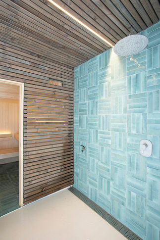 This wooden filter serves multiple functions: it works as solar protection preventing summer overheating, shelters the main staircase, an outdoor shower station and a small sauna cabin on the ground floor. On the first floor, it supports and encloses the outdoor living spaces. Furthermore, it acts as a filter between the house and the surrounding neighborhood, bringing privacy to the home in an otherwise quite exposed situation.