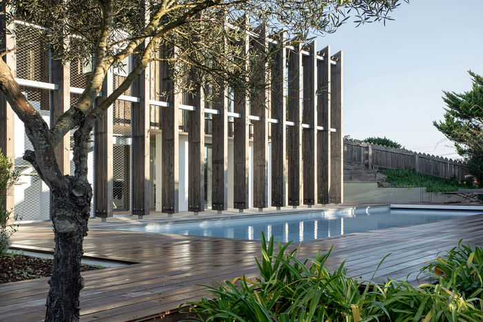 这一木质过滤器承载多种功能:既作为太阳防护,防止夏季房屋过热,也在地面层庇护主楼梯、户外淋浴站和小型桑拿舱。在一层,它支撑并围合了户外生活空间。最后,它也是房屋与周围社区之间的过滤屏障,在原本相当暴露的环境中为家庭带来隐私。