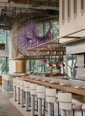 项目 - 位于上海的Aster餐厅,由英国主厨Joshua Paris领衔,RooMoo Design Studio设计,呈现了一次将植物几何学转译为沉浸式空间体验的创新表达。这座309平方米的餐厅以其同名花卉紫菀为灵感,紫菀在希腊语中意为"星",设计将花朵的自然结构——中心花盘被辐射花瓣环绕——转化为空间体验,邀请宾客在花心相聚,于星光下用餐。