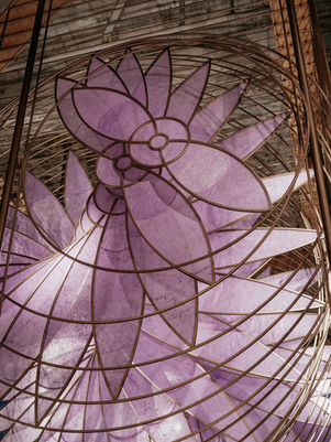 该设计最独特的特征是其创新的"花冠"装置设计概念。头顶由39片模块化框架以15度为间距顺时针螺旋排列而成,每个框架承载一片由回收宣纸制成的半透明紫色花瓣。夜幕降临时,周边灯光从外向内扫掠花瓣边缘,将天花板转化为漂移的星云。这种三维起伏的装置与可持续性设计相结合,花瓣可以重新染色,框架可重复使用,在保有仪式感的同时兼顾维护与环保。