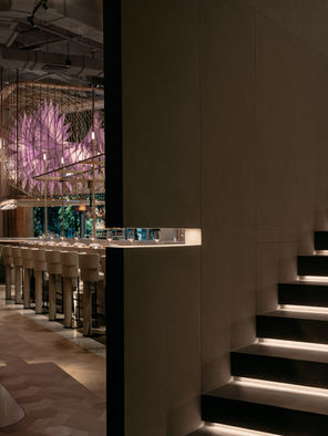 项目的显著特色是其精心编排的空间分层策略和社交价值。沿开放厨房侧廊拾级而上的夹层区域,以胡桃木与绒面营造私密氛围。为化解层高限制,顶面引入古铜色镜面天篷,以抽象花形图案分割,既拉伸垂直感又控制眩光。转入包间,上方"星尘"装置以半透明烟紫花瓣串联成星群,材质从硬到软形成梯度——石与木过渡到软包与织物。该项目由上海锐思派餐饮有限公司委托开发,RooMoo Design Studio负责整体室内设计,上海速霁装饰工程有限公司承担施工,上海佰姿照明工程设计有限公司担任照明顾问,上海逸筑装饰工程有限公司提供定制家具与灯具,展现了多方协作如何提升餐饮空间的美学品质与功能性。建筑通过引人注目的设计确保为上海餐饮文化做出有价值的长期贡献,证明了精致工艺与空间叙事可以在高密度都市环境中共存。这是一座为提升用餐体验而设计的空间,同时保持与可持续设计实践的强烈承诺。空间与城市的联系在精致平衡的对话中无缝整合,创造了用餐和社交互动的意义场所。