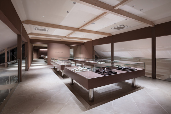 这座作品最引人注目的特点在于其精巧的建筑构图,巧妙地在截然不同的空间体验之间营造和谐对话。建筑核心是一个双层零售区,以温暖的棕色调墙面打造出私密氛围——这一精心的设计选择为婚戒的挑选提供了理想环境。