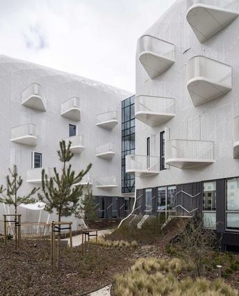 FAAB从摄影师皮埃尔·卡罗的《AquaViva》系列作品中汲取灵感,将海面近景的流动几何形态转化为起伏的上部建筑体量与雕塑感十足的入口雨篷,使这座建筑从传统医疗设施的刻板形象中彻底脱离。立面最引人注目之处在于以「生命之花」为图案的穿孔铝板饰面,这一古老的疗愈符号曾反复出现于古埃及神庙、印度建筑与玛雅文明之中。穿孔图案在平面板材、可变几何曲面板及窗户百叶间无缝延续,经由1:1实体模型的反复推敲,在采光、私密性与夏季遮阳隔热之间实现了精准平衡。