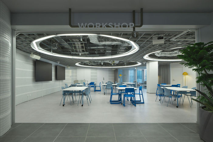 SQUARE引入更温暖明亮的材料,配以弧形家具和墙体,在保持对相邻区域和户外露台的视觉通透性的同时,营造出亲密的围合空间。这是一个联合办公空间,描绘柔和曲线的家具、垂壁和腰墙形成了高内包性的领域。这是一个兼具领域感和良好视野的空间,使用者的活动容易被看见,可以轻松对话和交流。使用明亮温暖的材料,营造出像与外部露台连续的广场般可以自由活动的场所。