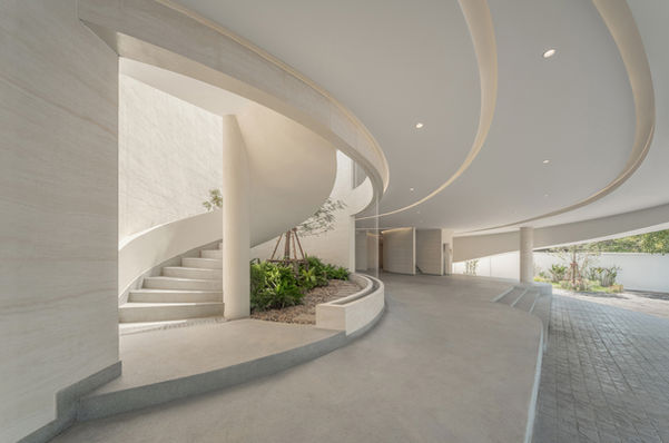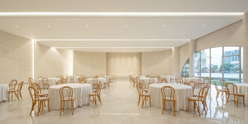 Project - The riverside wedding venue, The Rarin, designed by ASWA, features a distinctive round architectural design that beautifully symbolizes the unity and harmony of a wedding ring. The exterior showcases smooth, flowing curves, creating a striking visual impact while evoking a sense of continuity. These curves seamlessly connect two intricately entwined courtyards, serving as picturesque frames for the venue.